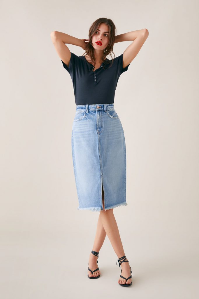 Un blazer larg, o camasa alba, o geanta tip servieta, stiletto si o fusta de blugi, midi. Sa fie conica, sa fie simpla de tot, cu talia inalta, eventual cu un mic slit! Perfecta pentru un Casual Friday, nu?