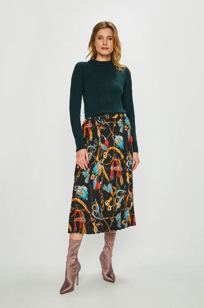 Am adaugat si alte articole-cheie, ce au sanse mari sa ramana in trend: jeansii cu rupturi, fustele plisate, fustele cu pattern de esarfa, pantalonii Cargo. Le vei putea asorta cu succes si in tinutele din sezonul rece viitor.