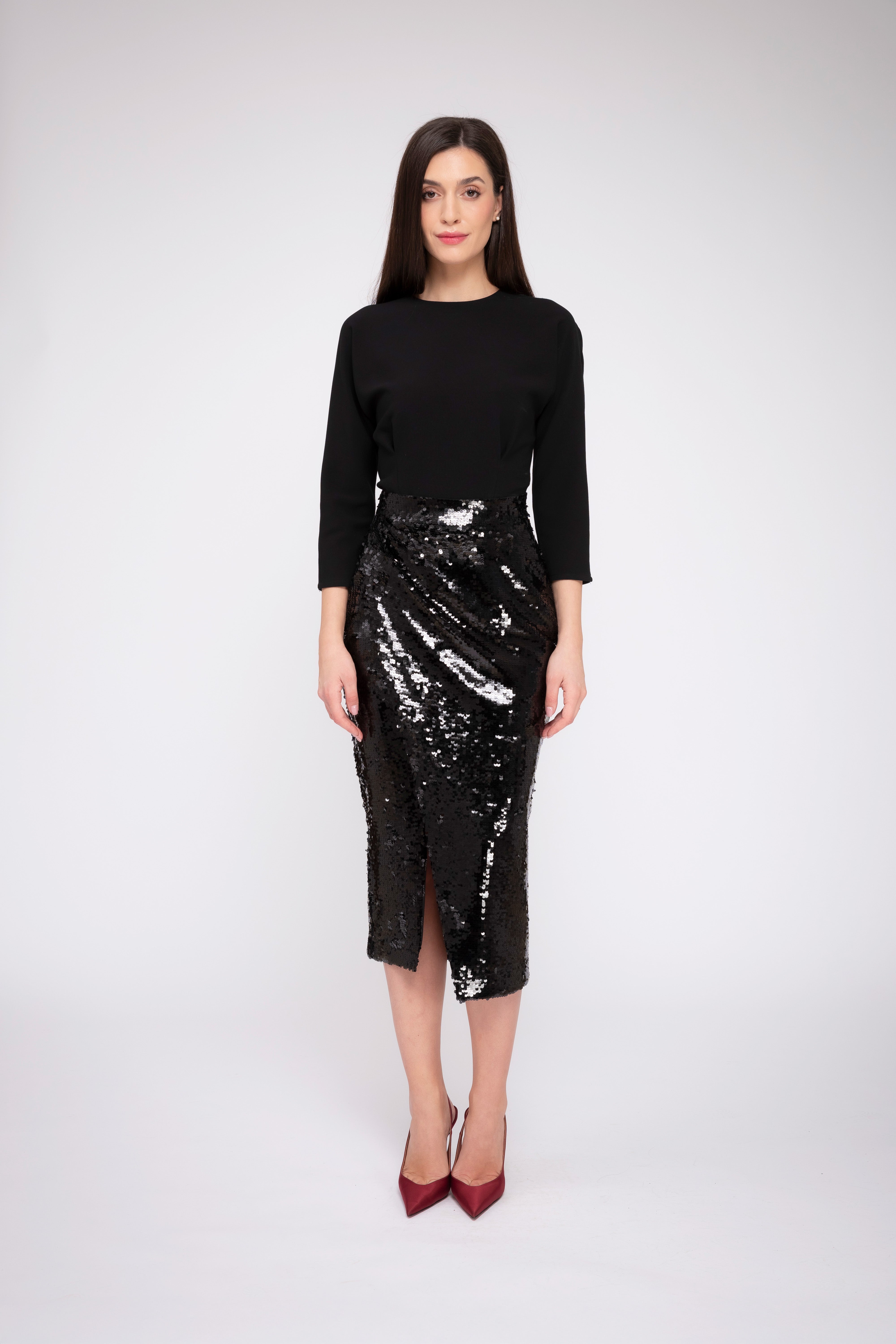 Daca ai nevoie de mai multa stralucire si glamour, nu dai gres cu fusta Gisele din paiete. Va fi un item statement in garderoba ta, la care poti apela de cate ori vrei ceva mai mult decat simplitate. Croiala fustei ramane clasica si feminina, talia marcata iti pune silueta in valoare, iar modelul petrecut aduce un pic de intriga. Poart-o cu pantofi fini si bijuterii discrete pentru un look de primavara sofisticat.