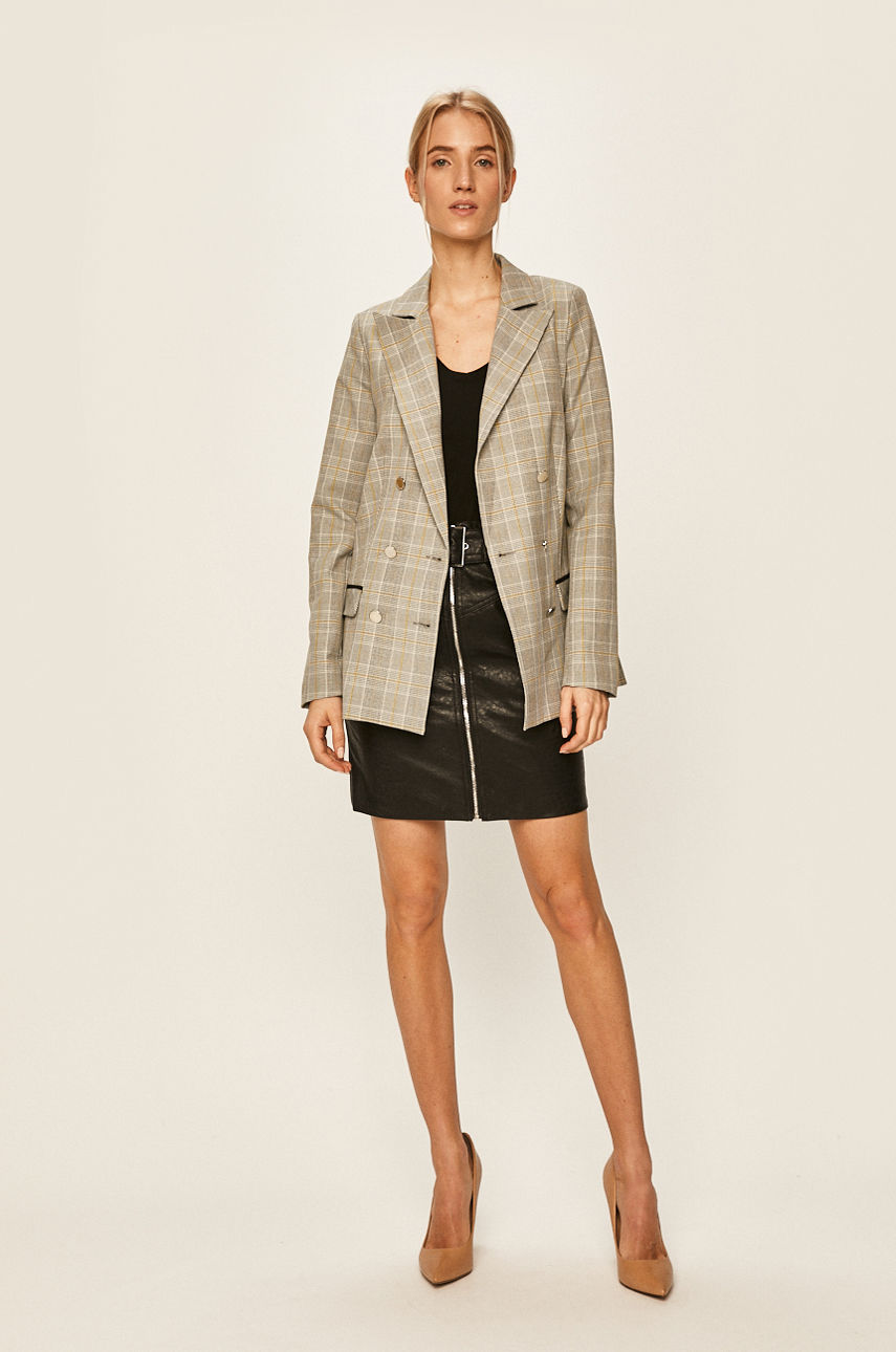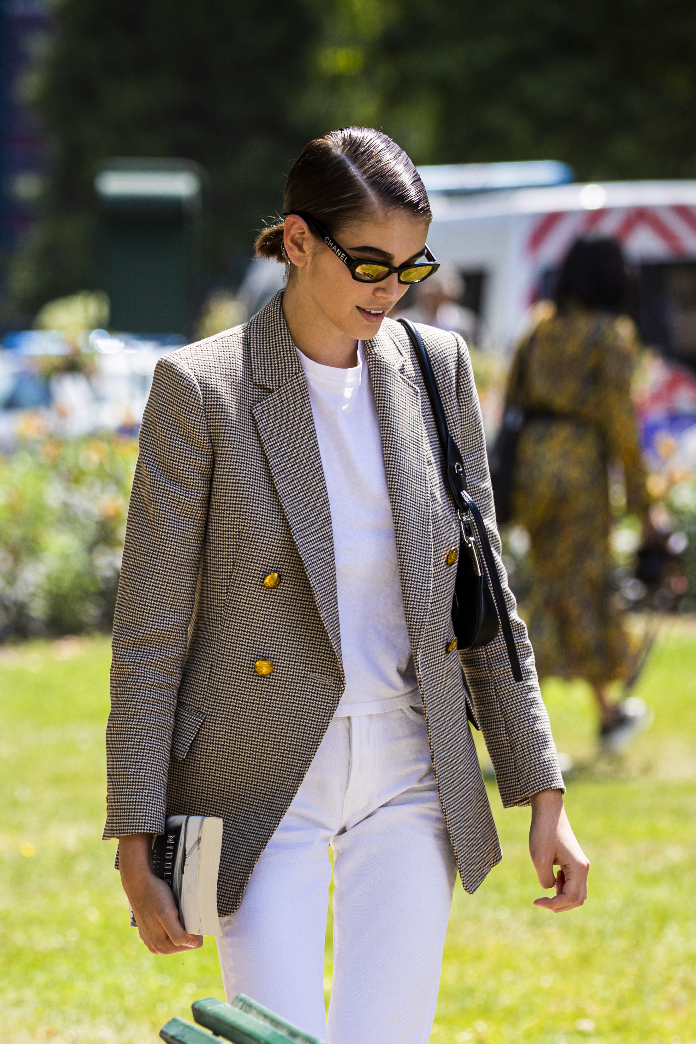 Kaia demonstreaza ca jeansii albi simpli se preteaza foarte bine pe stilul office, atata vreme cat ii combini cu un sacou de calitate in carouri. Ea a adaugat un tricou alb, care accentueaza simplitatea look-ului.