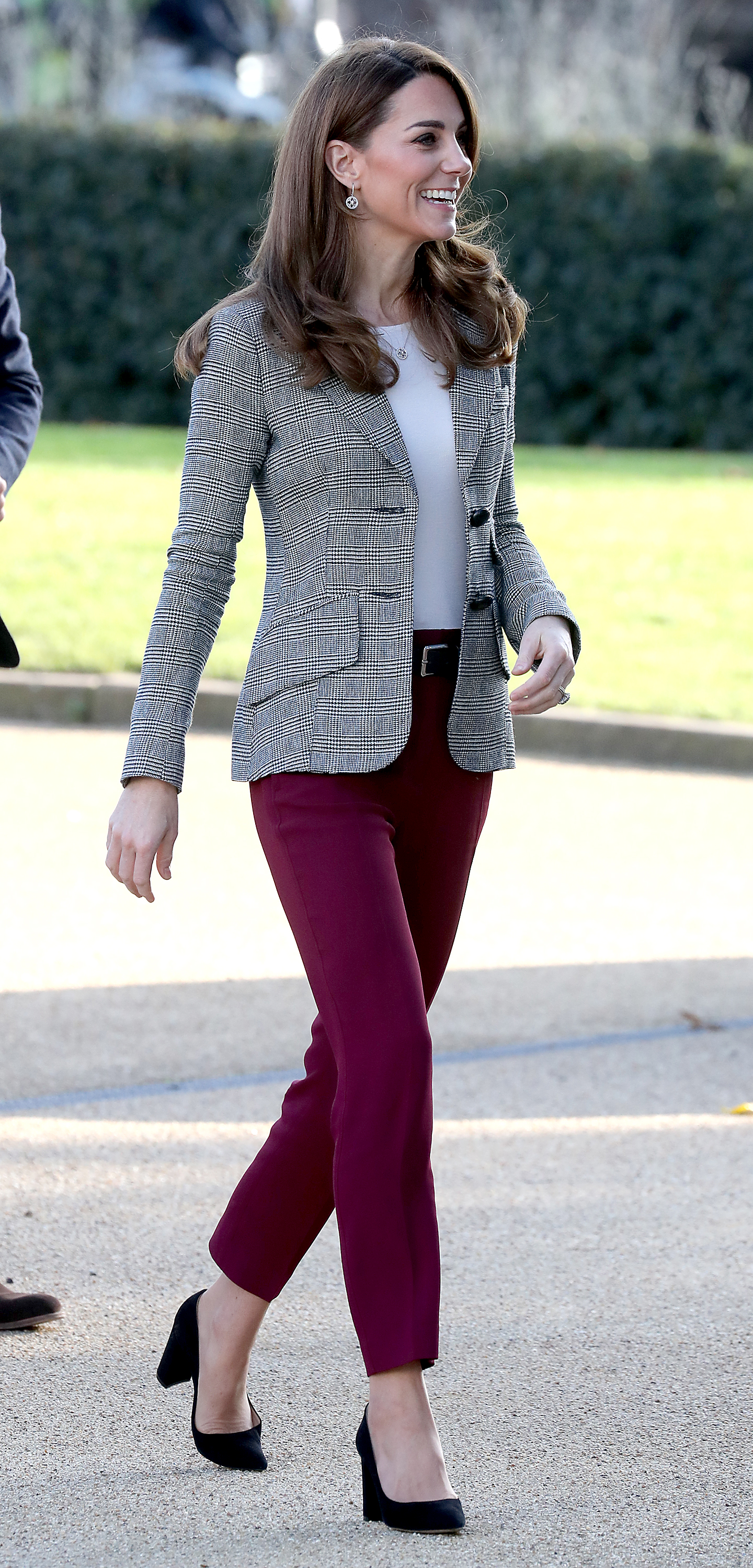 Pantalonii cu dunga sunt si ei o piesa office, insa raman feminini, mai ales daca optezi pentru o culoare atat de sofisticata precum movul. Nu orice femeie are curajul sa poarte aceasta nuanta statement, asa ca o admiram pe ducesa.