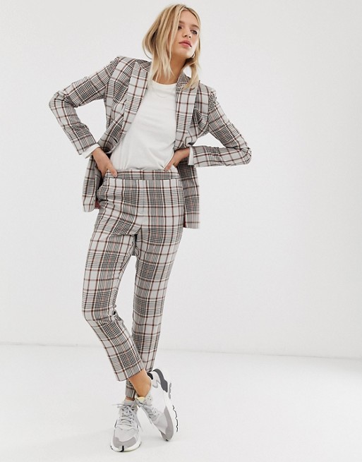 De inspiratie British, cu linie lejera, androgina, costumul cu sacou si pantaloni cadrilate poate fi purtat in tinutele de zi.