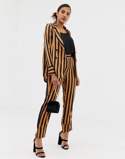 Nu este nimic mai cool decat imprimeul in dungi, purtat din cap pana in picioare! Acest gen de costum, croit din material fluid, amintind mai degraba de pijamale, este potrivit indiferent de context.