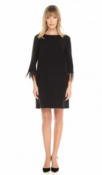 Ce imi place la aceasta rochie este versatilitatea ei. Desi are o linie clasica, simpla si minimalista, penele de la maneci o transforma instant intr-o tinuta eleganta de seara. Totusi, o poti purta si zi de zi la birou daca ii detasezi penele, asa ca investitia va merita. Poart-o cu pantofi stiletto, saboti, balerini sau sandale – iti permite orice tip de incaltaminte.