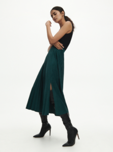 Fusta plisata poate fi extrem de versatila. Se potriveste in mai multe sezoane, poate fi combinata cu botine, cu pantofi sport sau din contra, pantofi eleganti, iar daca vremea este racoroasa, va arata foarte bine si in combinatie cu cizme. Fusta prezentata este dintr-un material mai gros, asemanator cu pielea intoarsa. Detaliul de pe picior ii taie putin din seriozitate si o face potrivita pentru orice femeie, indiferent de varsta. De asemenea, te provoc sa incerci sa renunti la negru si sa adaugi un strop de culoare in garderoba ta, cu acest verde padure, ideal pentru sezonul in curs.