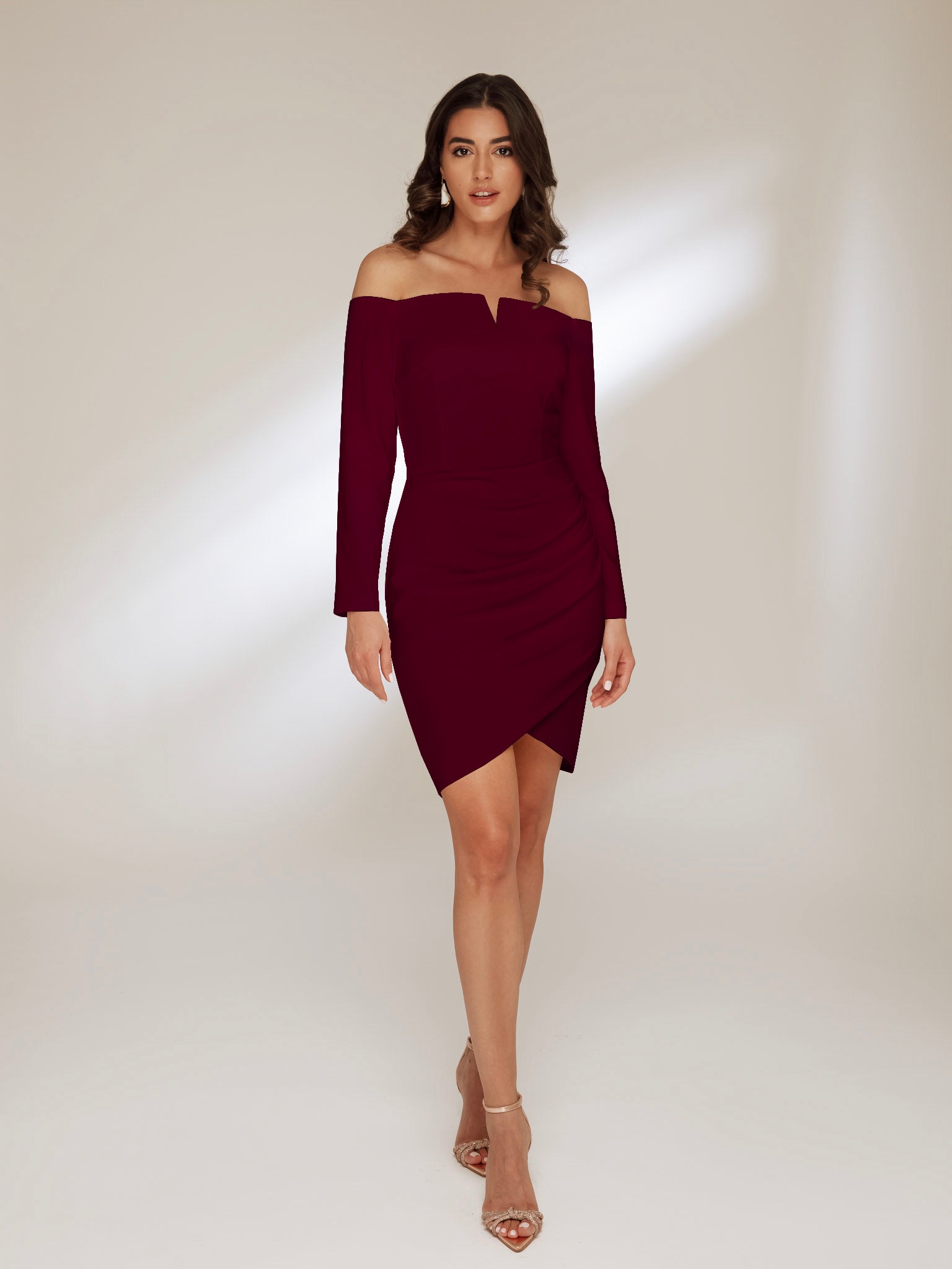 Purtand o rochie scurta in nuanta merlot, cu umerii delicat dezgoliti, vei capta atentia si vei impresiona la orice eveniment cu stil. Linia sa feminina evidentiaza silueta si iti ofera o prezenta de neuitat.