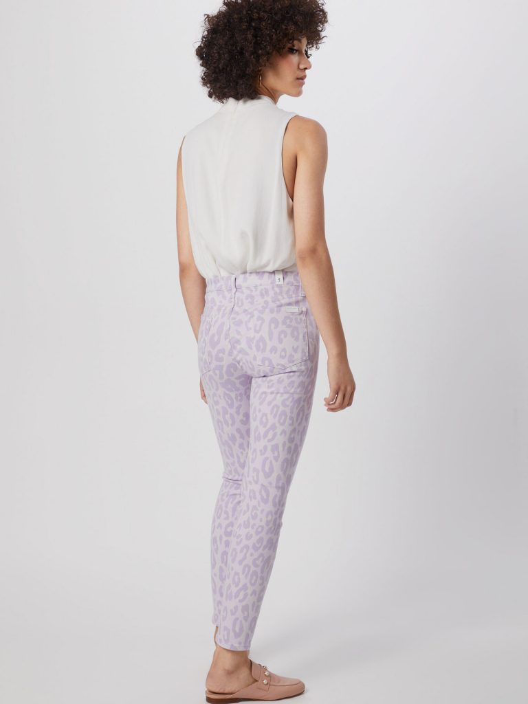 Acesti jeansi skinny cu imprimeu zebra sunt pentru cele mai curajoase dintre noi. Imprimeul cu doua nuante de mov deschis cere atentie, asa ca ti-as sugera sa-i porti cu un pulover simplu sau un t-shirt – alege unul monocrom, daca poti. Bumbacul elastic din care sunt facuti e confortabil, dar mai stramt decat celelalte optiuni prezentate aici, asa ca ai grija la marimi. Poarta-i cu botine cu toc sau sandale – pentru un efect de alungire a picioarelor (pantofii sport nu prea merg aici).