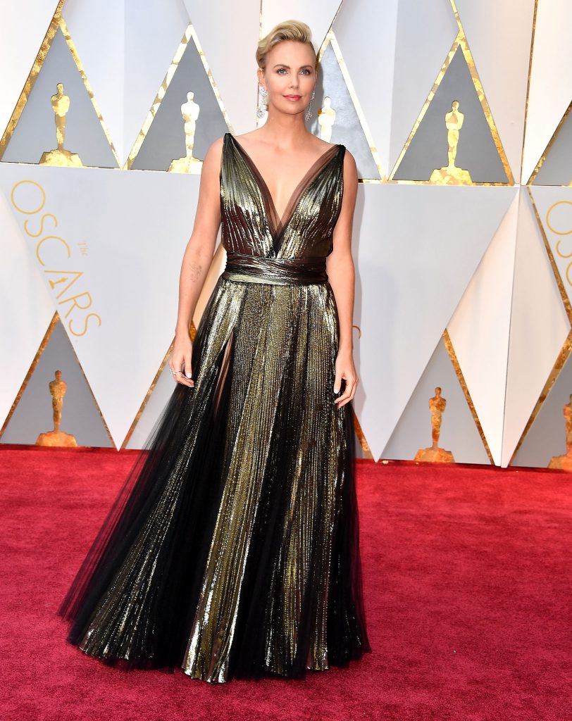 Va lasam mai jos cateva dintre cele mai spectaculoase rochii metalice purtate de Charlize de-a lungul timpului: