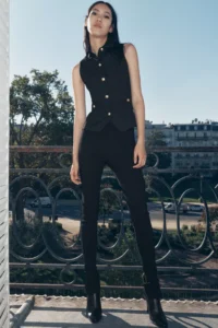 O tinuta all black cu vesta si pantaloni stramti iti va alungi silueta.