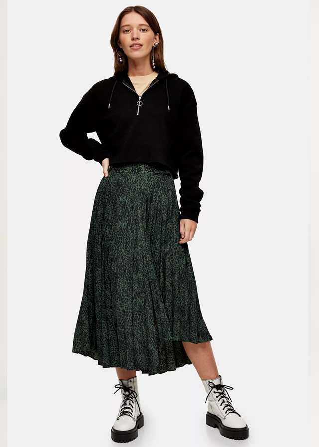 Alaturi de un blazer oversize, un tricou sau un pulover basic, fusta midi plisata creeaza o juxtapunere de efect.