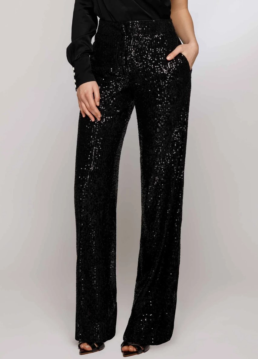 Ca tot vorbeam de stralucire, o alta tinuta pe care imi doresc sa o port de sarbatori este cea compusa din pantalonii din paiete si un top special. Ador tinutele all black, si mi se par extrem de potrivite chiar si de sarbatori: iti ofera acel aer elegant si iti permit sa te joci cu accesoriile dupa bunul plac. Este o tinuta perfecta pentru iesirile in oras cu prietenele tale sau pentru o petrecere glam.