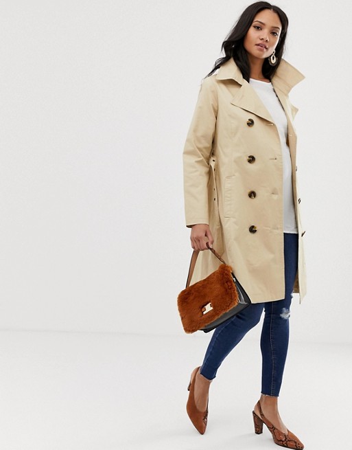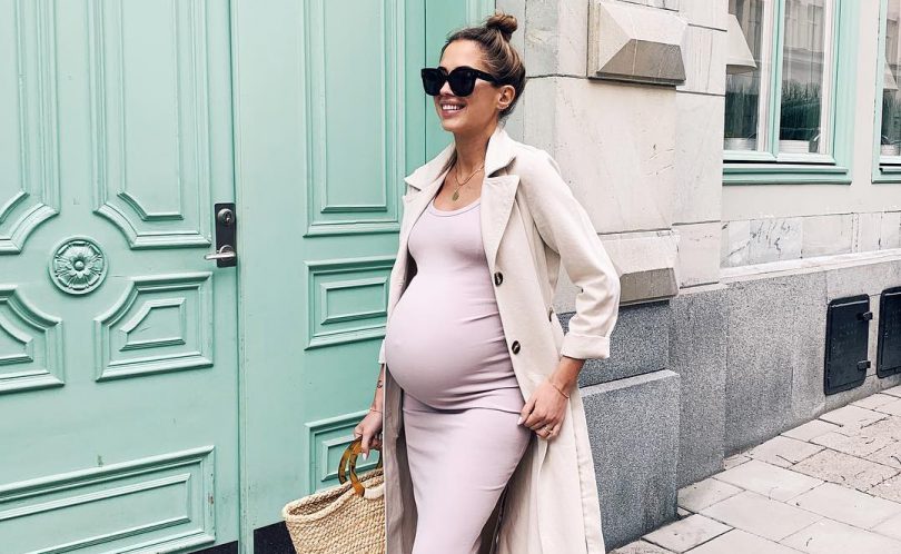 Prea multe femei renunta la hainele mulate cand sunt insarcinate. Insa acest look cu rochie stramta, trenci, pantofi sport si cos impletit este flatant si extrem de feminin!