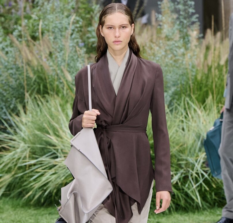 Piesele pentru seara includ paltoane si jachete croite deconstruite din matase, cu revere sal si finisaje cu paspoal. Incaltamintea include sneakers cu profil plat sau saboti din piele, cu un aspect si o senzatie de papuci.