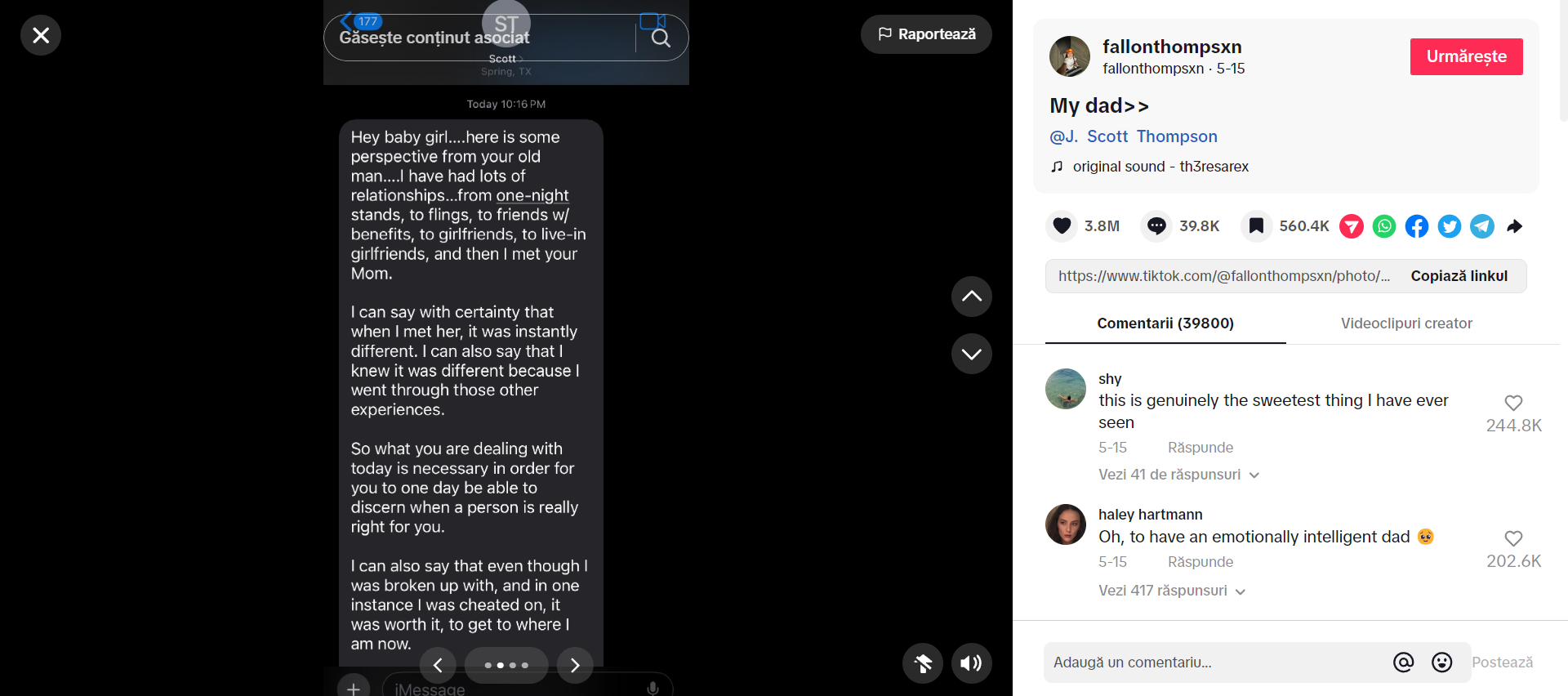 Utilizatoarea “Fallonthompsxn” a postat un TikTok sub forma de imagini in carusel, in care a impartasit un mesaj emotionant si plin de vorbe intelepte de la tatal ei. Videoclipul a primit aproape 4 milioane de aprecieri si zeci de mii de reactii in sectiunea de comentarii.