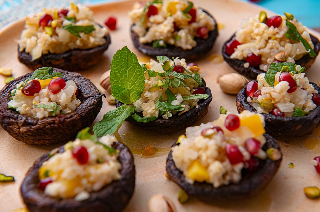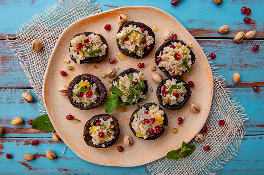 Incingem cuptorul la 180 grade Celsius. Curatam ciupercile si indepartam picioarele. Asezam ciupercile pe o tava, cu fundul in sus, si le stropim cu putin ulei de masline, sare si piper. Le coacem timp de 20 minute.