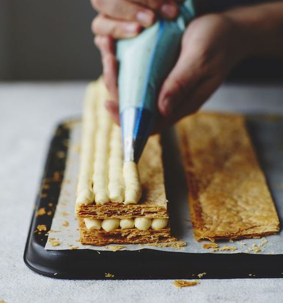 Dupa ce s-a racit, se umple o punga pentru decorat cu crema si se intinde crema pe prima fasie de aluat. Crema se intinde de la un capat la celalat, in linii paralele.