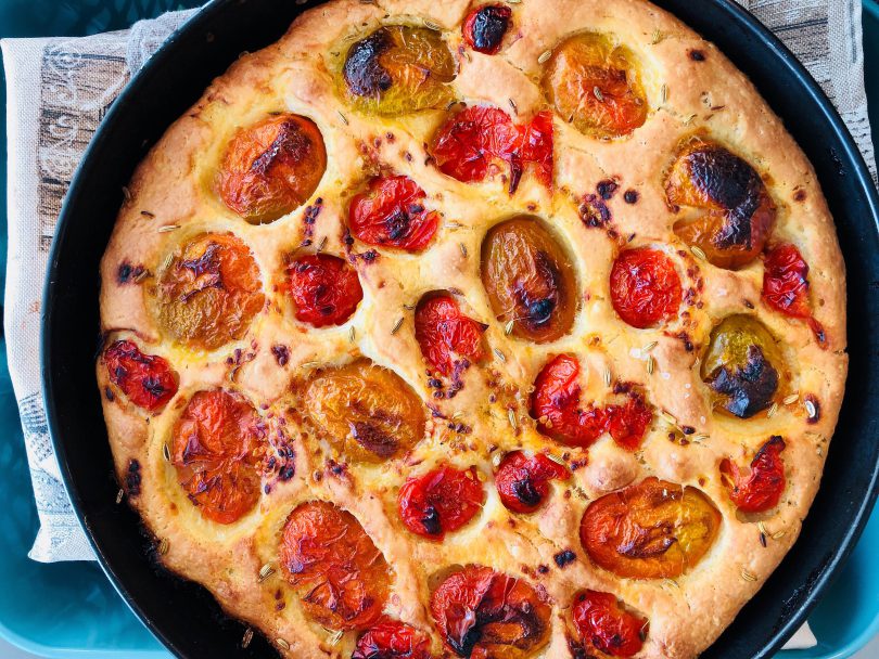 Deasupra se pun jumatatile de rosii cherry, apasandu-le usor ca sa intre partial in aluat. Tavile se dau la cuptor pentru 20-25 de minute sau pana cand partea de deasupra incepe sa se rumeneasca.