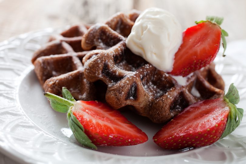 Foloseste o inghetata vegana de vanilie ca topping peste gofrele cu cacao si orneaza cu bucati de capsune proaspete.