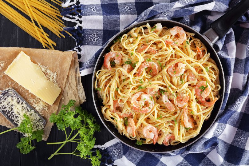 Ingrediente pentru linguini cu creveti si ton: