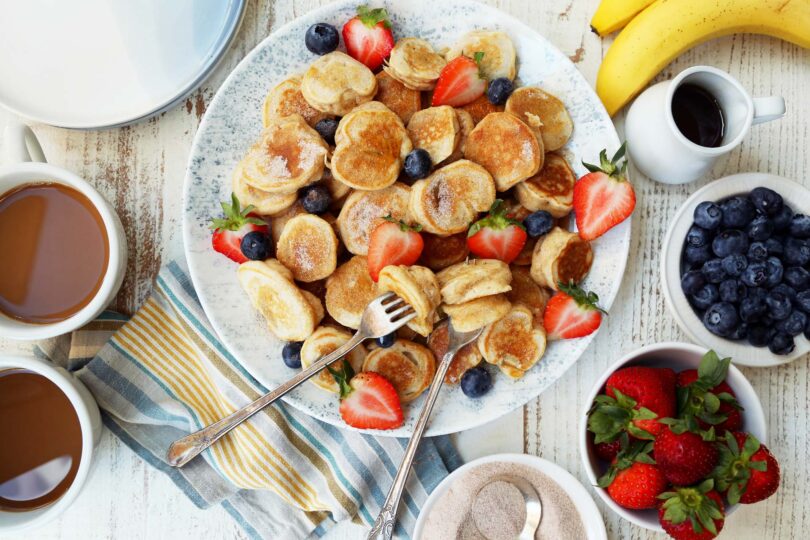 Serveste mini-pancakes cu banane cat sunt fierbinti, presarate cu zahar pudra sau cu putina miere sau dulceata ta preferata. Poti adauga si alte fructe proaspete sau un praf de scortisoara. Din cantitatile de mai sus vei obtine doua portii de pancakes.