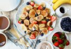 Topping-uri: capsune, zmeura, afine, fulgi de cocos, sirop de artar