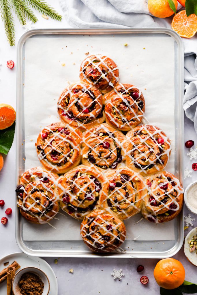 Folosind un cutit mare si bine ascutit, taie aluatul in 12 bucati egale. Aseaza melcii in forma de brad de Craciun, cu partea taiata in sus (asigura-te ca le lasi spatiu de crestere). Iti va mai ramane unul, pe care il poti coace deoparte, intr-un colt al tavii (premiu pentru tine, pentru tot efortul depus).