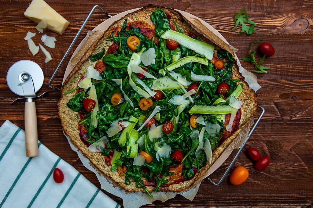 Cand blatul este gata si usor maronit pe margine, intinde 2-3 linguri de pasta de rosii, pune din amestecul de frunze verzi din belsug si cateva rosii cherry proaspete. Coace pizza pentru inca 5-10 minute.