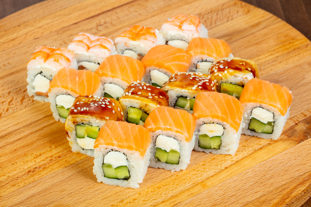 Amesteca orezul cu otetul, sosul de soia, ghimbirul ras, apoi intinde feliile subtiri de fileu de somon marinat pe folia de plastic (sub ea pune un napron din betisoare de bambus sau un prosop). Adauga mixul de orez si intinde-l pe toata suprafata foliei. Adauga ricotta si uniformizeaza toata suprafata cu o spatula de silicon, dupa care, aseaza betisoarele de castravete. Ruleaza si taie in bucati. Serveste sushi-ul proaspat preparat cu sos de soia dietetic (continut redus de sodiu) si seminte de susan.