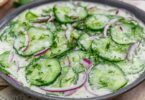 Ce poate sa fie mai racoritor intr-o seara torida de vara decat o salata cu castraveti, rosii gustoase, telina apio, masline kalamata, salata crocanta, putina ceapa, frunze proaspete de menta si branza feta presata deasupra?