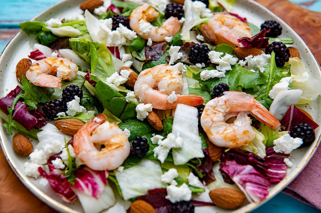Aranjam intr-un bol salata, presaram migdalele, murele, branza de capra si turnam vinegreta obtinuta. Adaugam crevetii si savuram.