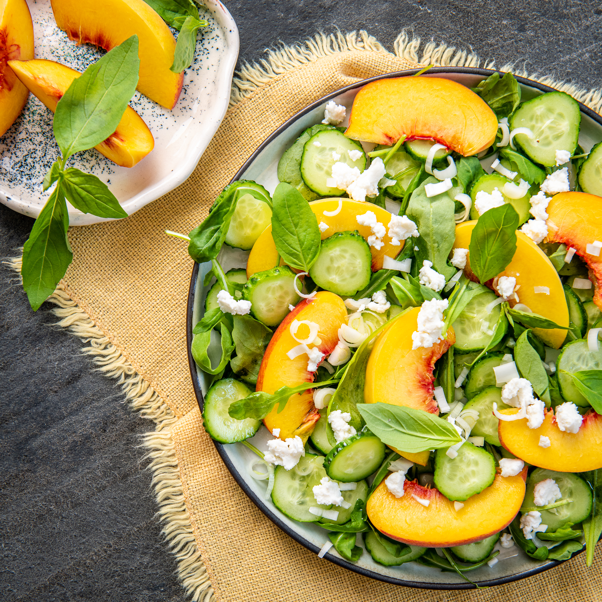 Intr-un bol punem frunzele verzi spalate, castravetii taiati felii subtiri, piersicile felii si ceapa verde tocata marunt.