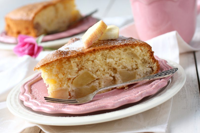Se preincalzeste cuptorul la 170 grade Celsius. Se ia o tava rotunda, cu diametrul de 18 cm, si se tapeteaza cu hartie de copt. Hartia se unge cu unt, la fel si peretii tavii. Merele se curata, se taie jumatati, apoi se taie in bucati de dimensiuni medii. Bucatile de mar se pun direct in tava de copt.
