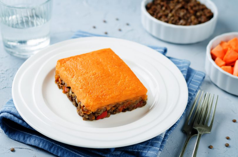 Fara carne si fara cartofi obisnuiti, aceasta placinta este alternativa excelenta pentru persoanele care urmeaza un regim vegetarian sau vegan. Va avea la baza fasolea boabe, care inlocuieste carnea tocata (de asemenea, mai poti sa folosesti lintea), iar deasupra se inlocuieste piureul din cartofi obisnuiti cu unul din cartofi dulci.