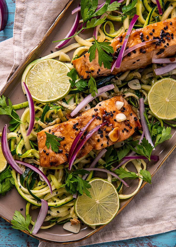 Scoatem somonul pe un platou, turnam deasupra sucul ramas si decoram cu ceapa verde tocata, seminte de susan si coriandru.