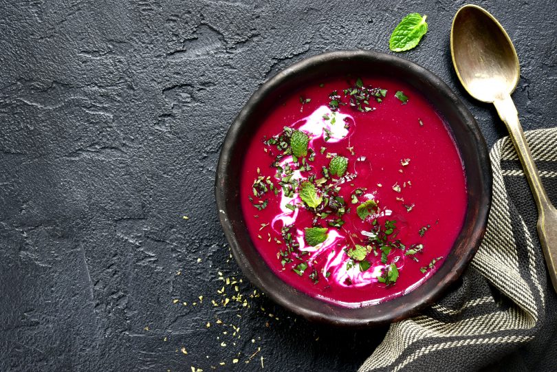 Într-o cratita se calesc legumele in uleiul de cocos timp de 5-7 minute, se adauga sfecla taiata si apa calda, dupa care se paseaza totul cu un blender de mana.