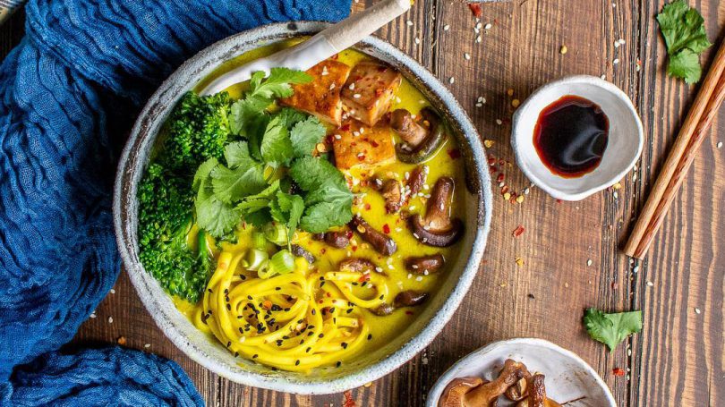 Cu ajutorul unui blender de mana se mixeaza supa de cocos pana cand devine cremoasa, apoi se pun taieteii de orez si se gatesc conform instructiunilor de pe ambalaj. Se imparte supa in 2-3 boluri, iar deasupra de pun bucati de tofu, broccoli si ciuperci. Se decoreaza cu coriandru proaspat, fulgi de ardei iute, seminte de susan si ceapa verde.