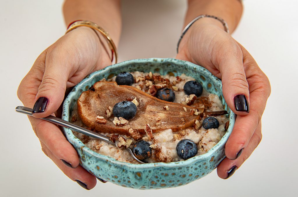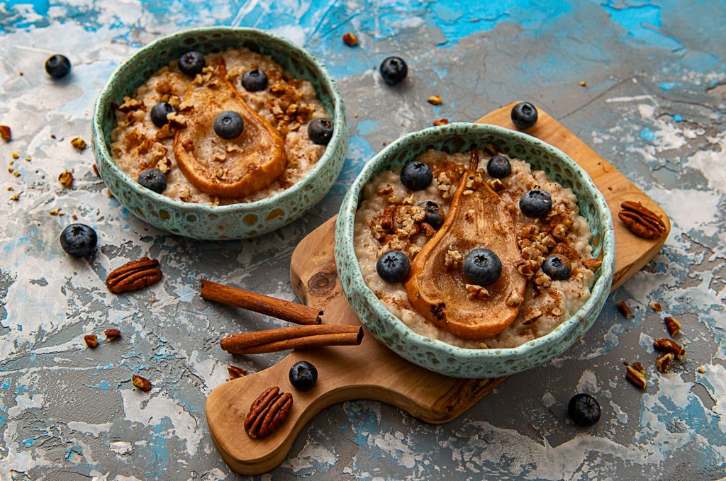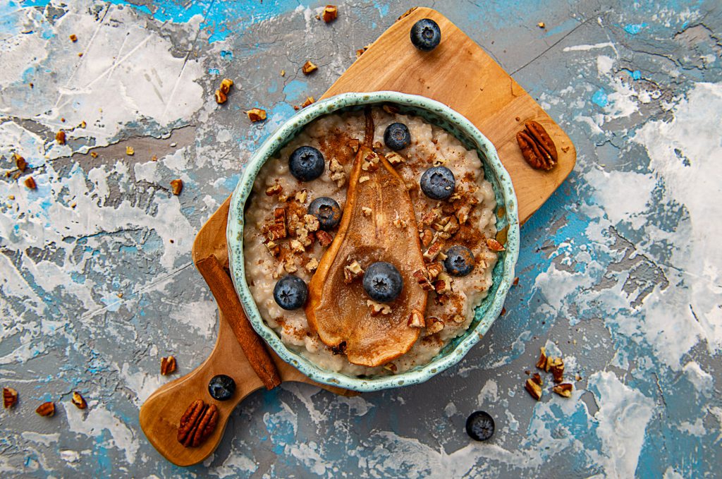 Serveste terciul de ovaz cu para coapta deasupra, cu nuci pecan presarate, afine proaspete si un strop de miere si scortisoara macinata.