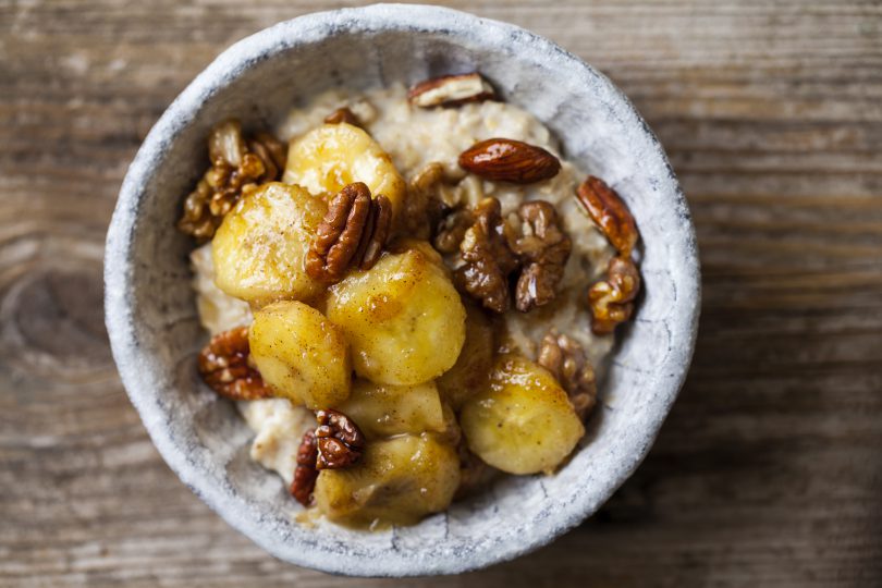 Cum sa nu-ti placa bananele caramelizate in sirop de artar, impreuna cu un terci de ovaz cremos, totul “asezonat” cu chipsuri de ciocolata, nuci, migdale, alune sau oricare ar fi toppingul tau preferat? Si, daca e bun pentru tine, cu siguranta ca si cei mici il vor aprecia si va deveni un mic dejun intens solicitat.
