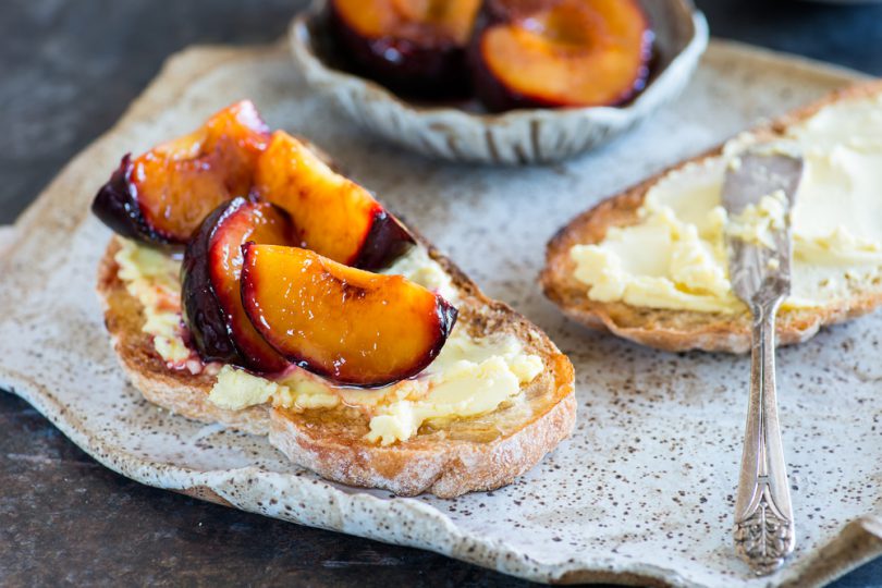 Prunele coapte si mierea tempereaza aroma pregnanta a branzei de capra, conferind dulceata unui inceput de zi perfect.
