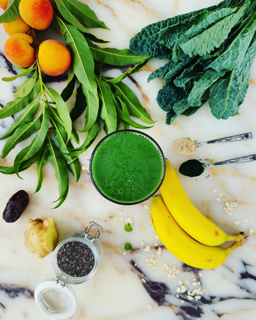 Cea mai buna combinatie pe care am facut-o in ultima perioada contine zucchini, castravete, kale, pepene galben, ananas, ghimbir, spirulina, seminte de chia si lapte vegetal. Eu adaug si cateva cuburi de gheata, ca sa il fac mai racoros.