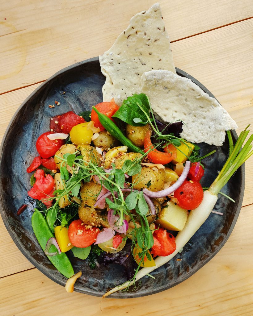 Folosesc multe legume proaspete: spanac, avocado, rosii, castraveti, ardei rosu, dar si legume pe care le prepar, cum sunt cartoful dulce sau dovlecelul. Adaug intotdeauna si o sursa de proteina vegetala, cum ar fi lintea sau quinoa. Si nu renunt nici la dressing, insa va fi unul usor, putin picant, cum ar fi cel din tahini, tamari, suc de lamaie si chili. Iar pentru mai multa savoare, adaug si cateva migdale rumenite. O astfel de salata iti va satiface papilele gustative si te va tine satula pana seara, garantat!