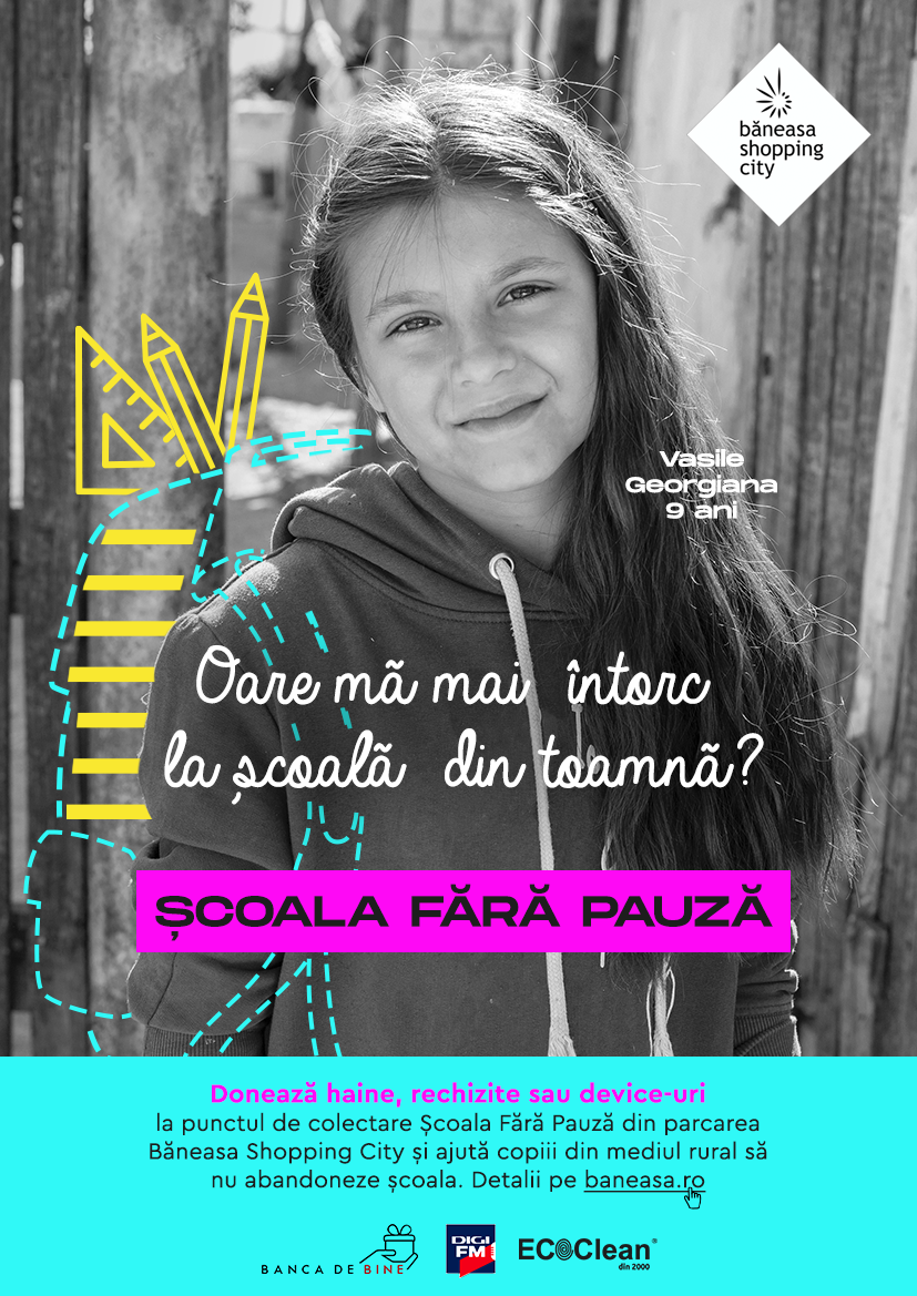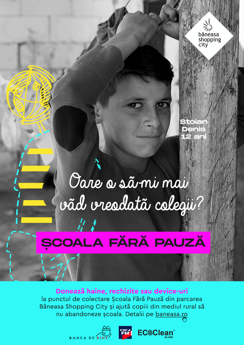 Campania “Scoala fara pauza” se deruleaza cu sprijinul EcoClean precum si a partenerilor media DigiFMsi DIGI24. Pentru mai multe detalii, puteti accesa pagina: www.baneasa.ro.