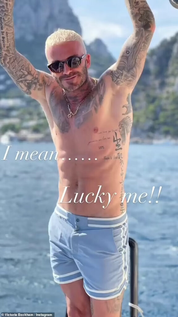 In fotografia facuta in vara, in timpul vacantei din Italia, David Beckham apare doar intr-o pereche de pantaloni scurti bleu, etalandu-si fizicul impunator si colectia impresionanta de tatuaje de pe corp.