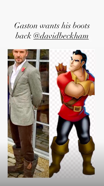 Victoria a postat apoi pe contul sau de Instagram o versiune editata a imaginii in care compara cizmele lui David cu cele ale lui Gaston, personajul din „Frumoasa si Bestia”, scrie Harper’s Bazaar. „Gaston isi vrea cizmele inapoi @davidbeckham”, a scris ea.